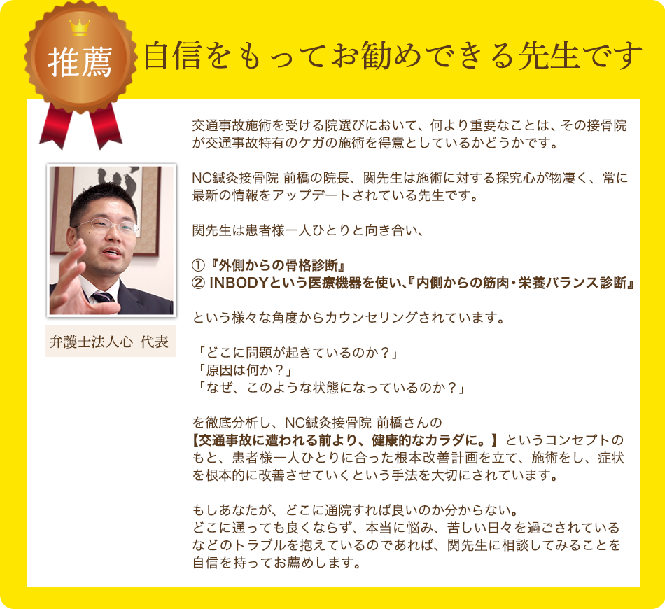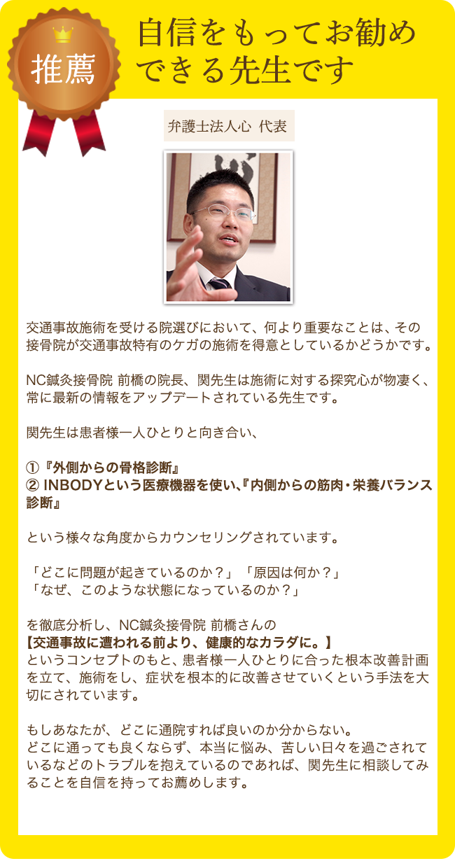 今後、私の周りで交通事故対応で困っている方がいれば是非紹介したい接骨院さんです。自身をもってお薦めします!